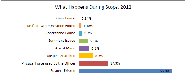 The yield from these encounters between police officers and pedestrians is small. In 2012, for example, only 6% of stops resulted in arrest.