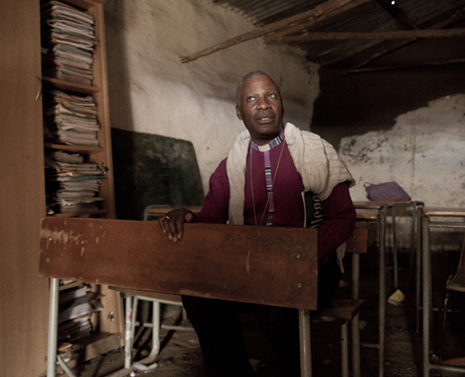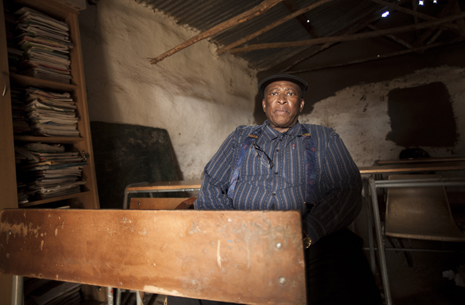 Photo: Zakes Mda sits inside a mudschool, Samson Senior Secondary